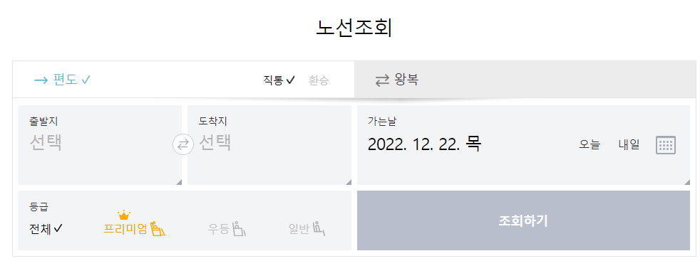 그러면 편도로 갈지 왕복으로 갈지 와복이면 가는날은 언제고 오늘날은 언제인지를 체크하고 고속버스 등급까지 체크한후 조회를 클릭합니다.