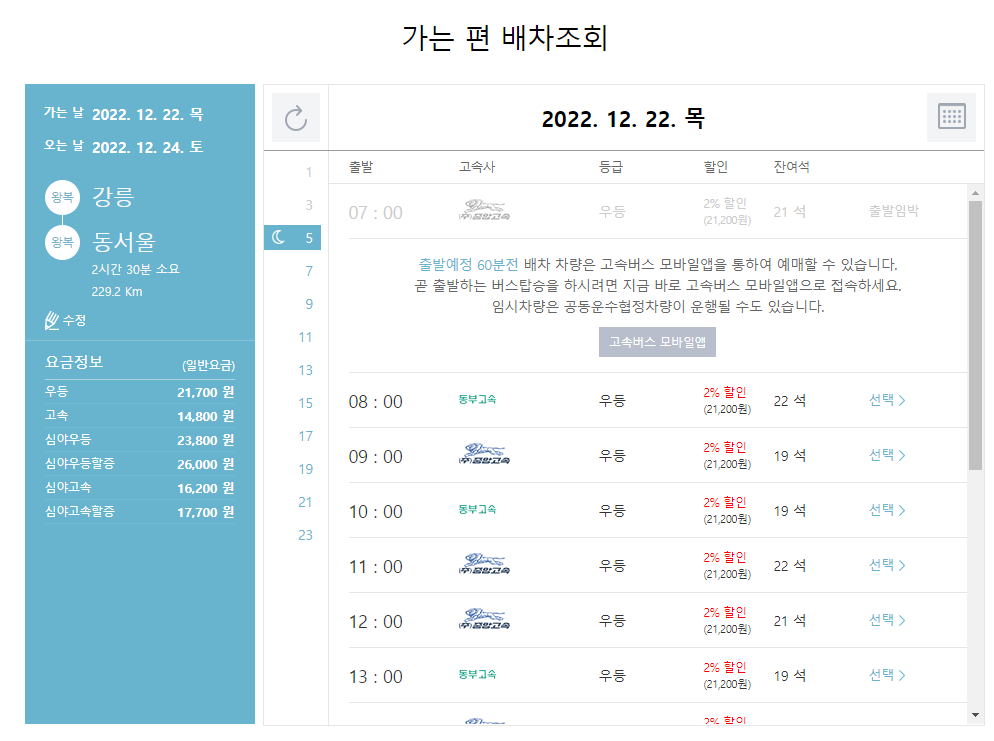 그러면 예약 가능한 고속버스 가격 및 시간을 확인할 수 있습니다.