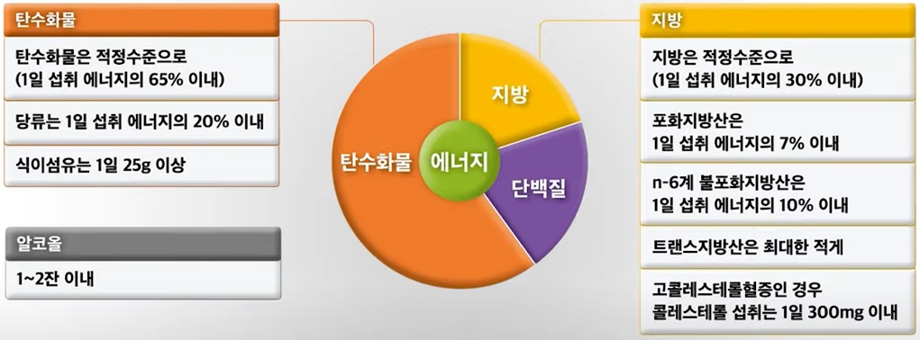 그러나 여기에도 함정이 있습니다. 너무 과도한 식이 콜레스테롤 섭취는 LDL콜레스테롤과 혈중 콜레스테롤을 높일 수 있습니다. LDL 콜레스테롤을 낮추기 위해서는 어떤 식사를 해야 할까요? 첫 번째는 앞서 말씀드렸듯이 포화지방의 섭취를 줄이는 것입니다. 두 번째는 불포화지방산이라 할지라도 과도하게 섭취를 하면 지방은 에너지 효율이 매우 좋아서 에너지 과잉이 됩니다. 따라서 전체 지방량도 적절하게 조절하는 것이 좋습니다. 그렇지만 같은 지방을 섭취할 때는 포화지방보다는 불포화지방으로 섭취하는 것이 좋습니다. 그리고 에너지 과잉이 되면 결과적으로 고지혈증뿐만 아니라 내장비만을 증가시키고 당대사를 안 좋게 하기 때문에 당뇨병, 대사성 질환 이런 위험을 올릴 수 있습니다. 전체적인 에너지가 과잉되지 않게 조절하는 것도 매우 중요합니다. 결론적으로는 적절한 체중조절이 중요하다는 것입니다. 균형 있는 식사를 하는 것이 매우 중요하다는 것입니다.