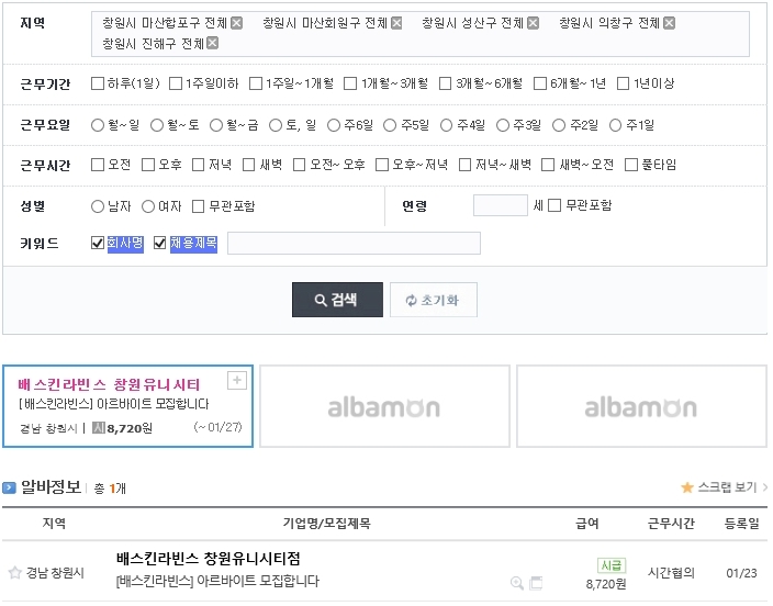 배스킨라빈스 브랜드 알바는 창원 유니시티점 한자리만 있는 것을 확인 할 수 있습니다. 브랜드 알바 역시 세부적인 정보를 입력하다 보니 구인 구직하는 곳이 적은 것 같습니다.