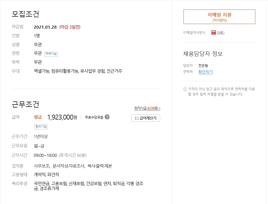 구인구직 정보는 급여와 근무기간 등과 같이 여러가지 정보를 한눈에 확인할 수 있습니다. 그리고 우측에 있는 이메일을 이용하면 즉시 해당 업체에 지원할 수 있는 서비스를 이용할 수 있습니다.