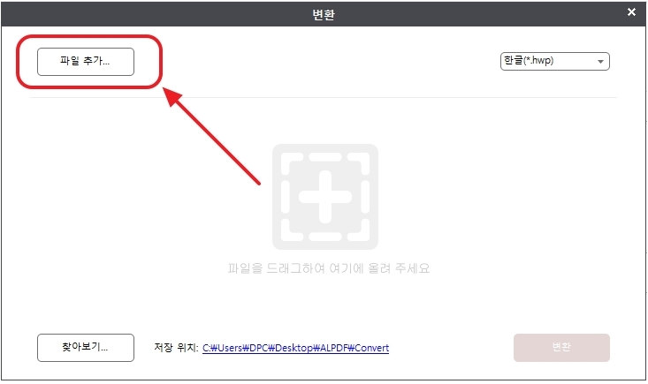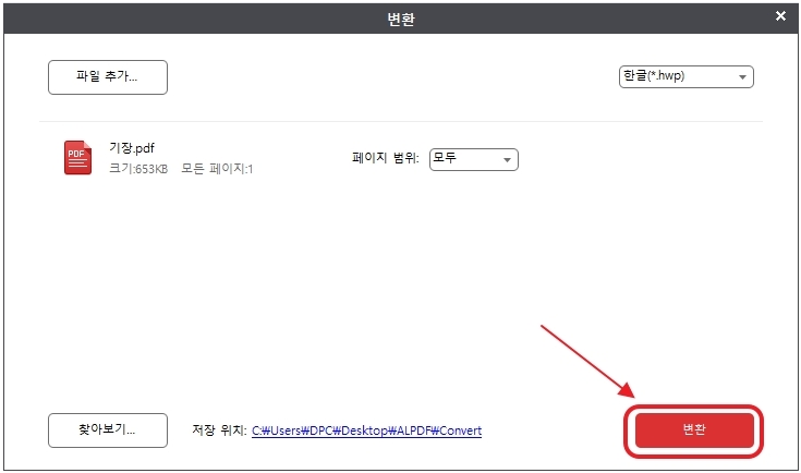 pdf로 변환할 한글 파일을 추가하고 '변환'을 클릭합니다.