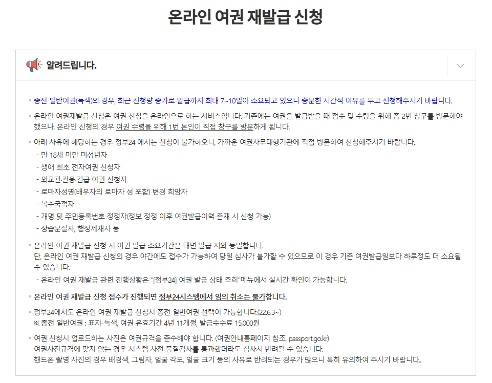 온라인 여권 재발급에 있어서 주의해야 할 점등이 적혀 있습니다. 정부24로 신청이 불가한 경우와 여권 수령을 위해 1번 본인이 직접 창구를 방문해야 된다는 문구가 눈에 뛰네요. 참고하세요.