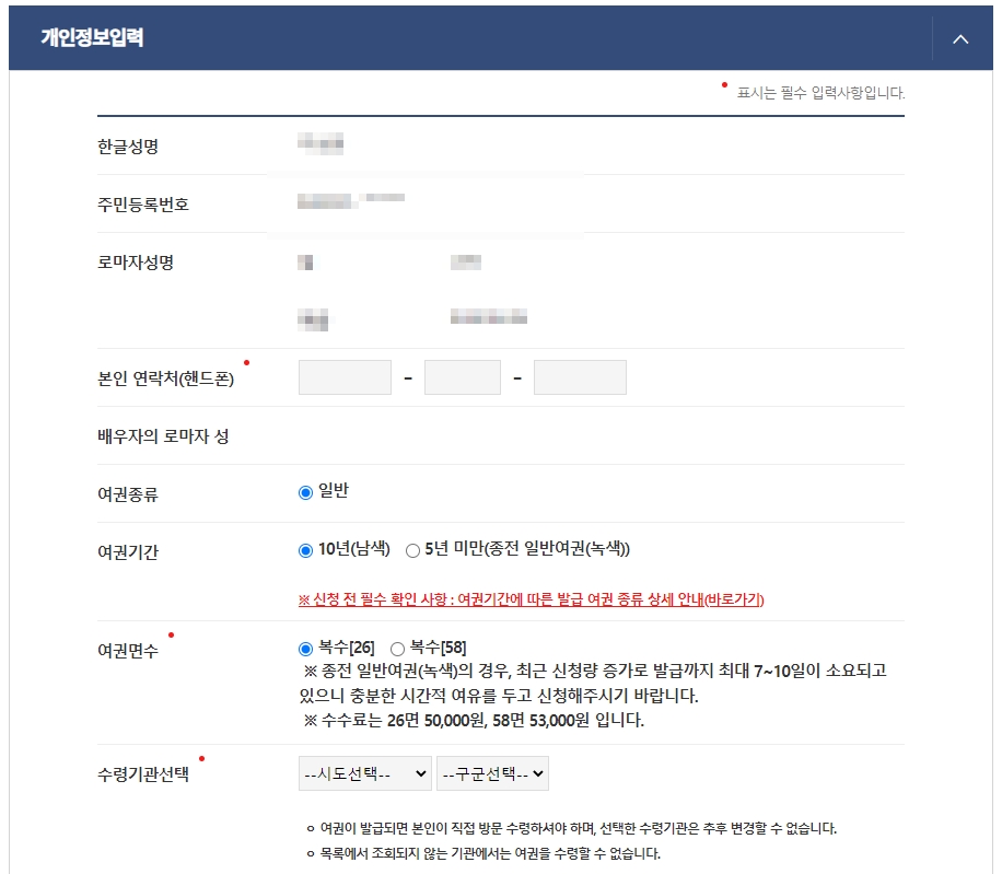 · 수록정보 변경(한글성명, 본인 또는 배우자 로마자성명, 여권사진, 주민등록번호 변경)으로 재발급하는 경우