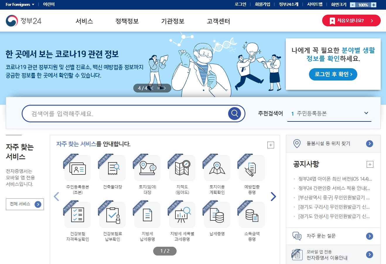 위화면은 정부 24 홈페이지 메인화면입니다.