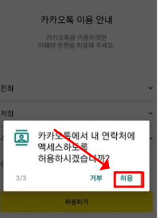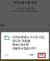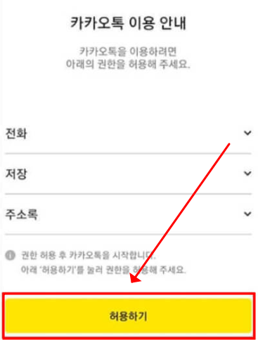 먼저 새로산 핸드폰에 카카오톡 어플을 설치하고 실행합니다. 그러면 위화면과 같이 카카오톡 권한 허용하기가 나옵니다. 허용하기를 클릭합니다.