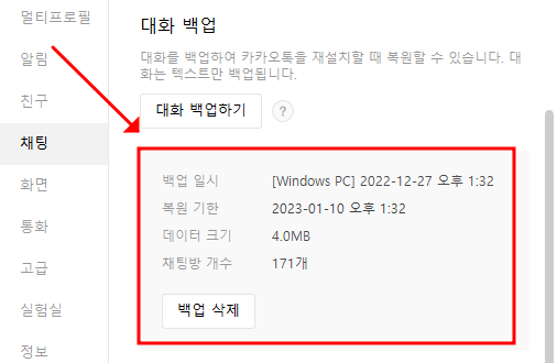 대화 백업이 완료 되면 위화면과 같이 백업이 된 내용을 확인할 수 있습니다.