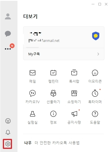 카카오톡 pc버전 다운로드 & 설치가 완료 되셨다면 초기 세팅을 해야합니다. 초기 세팅을 위해서는 카카오톡 pc버전 좌측하단에 톱니바퀴 모양을 클릭합니다.
