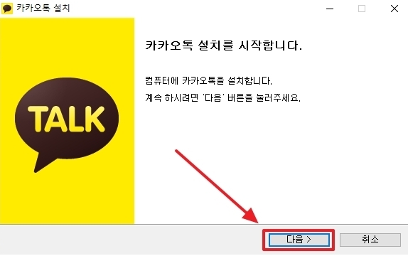 카카오톡 설치 시작을 위해서 화살표로 표시된 '다음' 버튼을 클릭합니다.