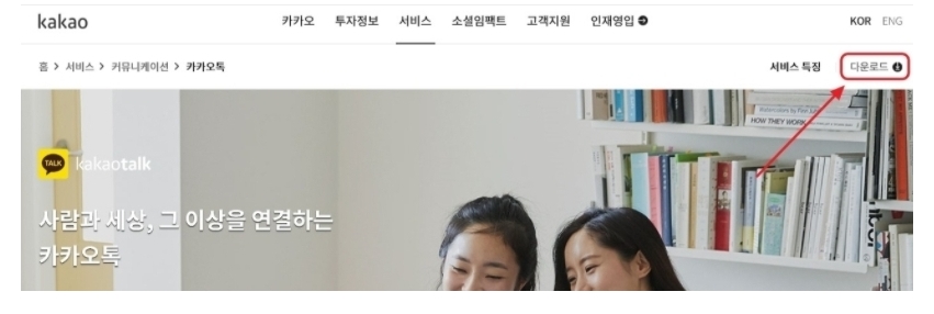 카카오톡 홈페이지 메인화면 우측 상단에 다운로드를 클릭합니다.