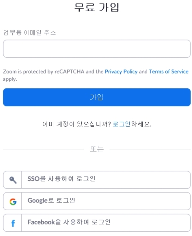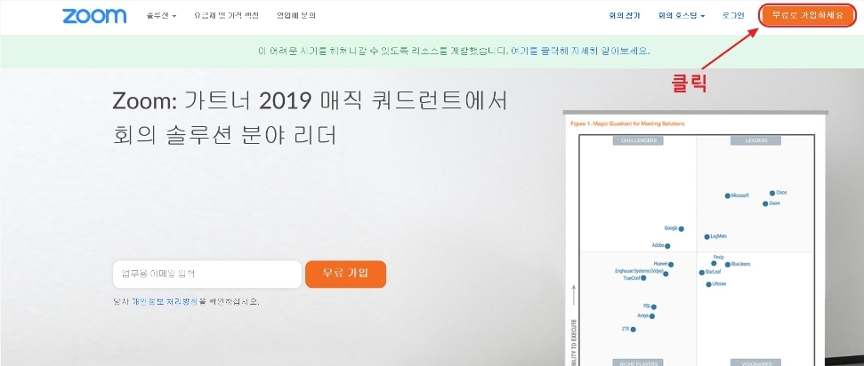 zoom 화상회의를 이용하기 위해서는 회원가입을 해야 사용할 수 있습니다. 우측 상단에 '료 가입하세요'를 클릭합니다.
